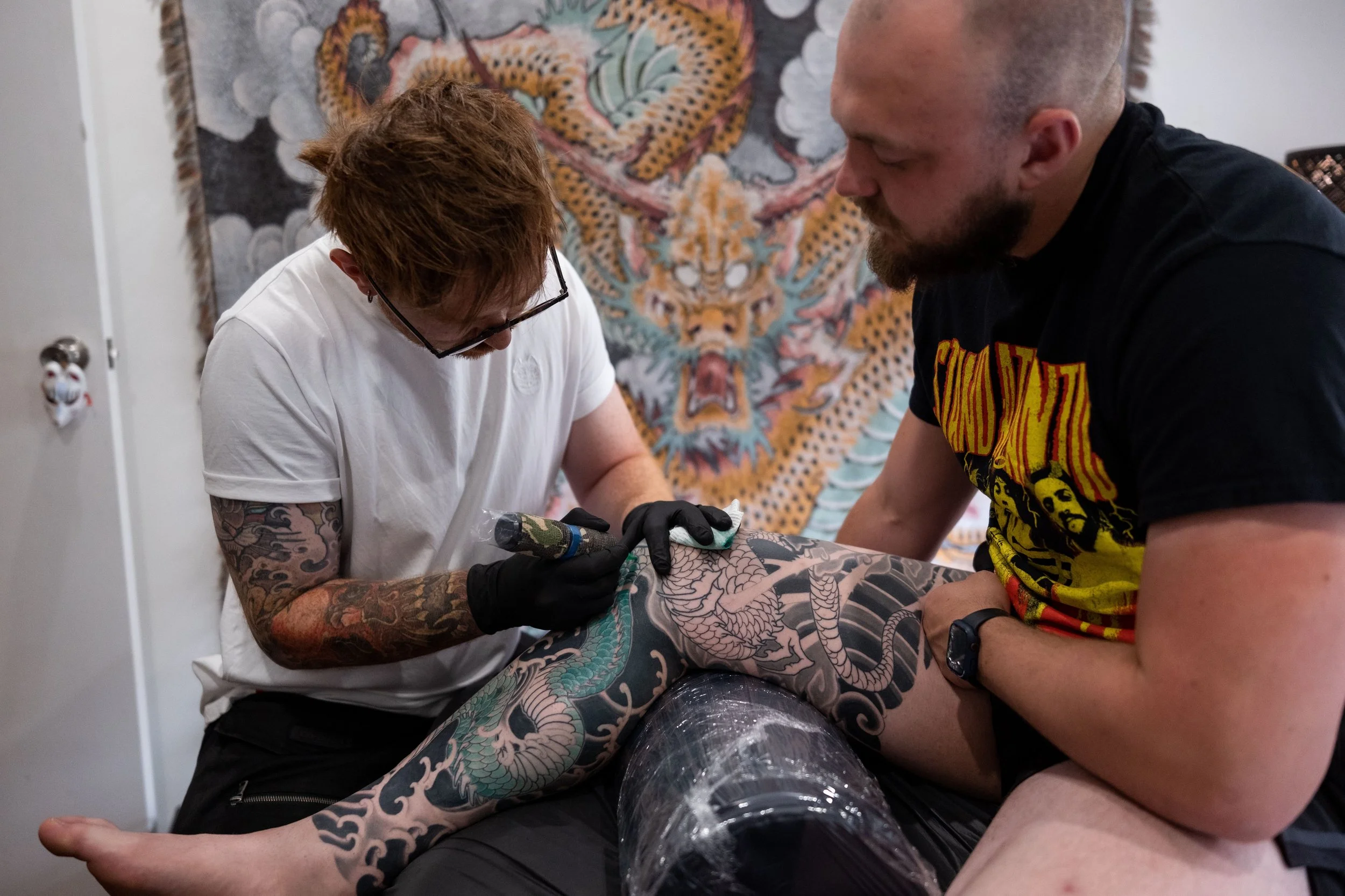 Tattooing since 2017, I have always been deeply fascinated with Japanese art and culture. Drawing inspiration for my work from Irezumi and Ukiyo-e woodblock prints, my work focuses on boldly dynamic and flowing designs that suit the body on a large scale.